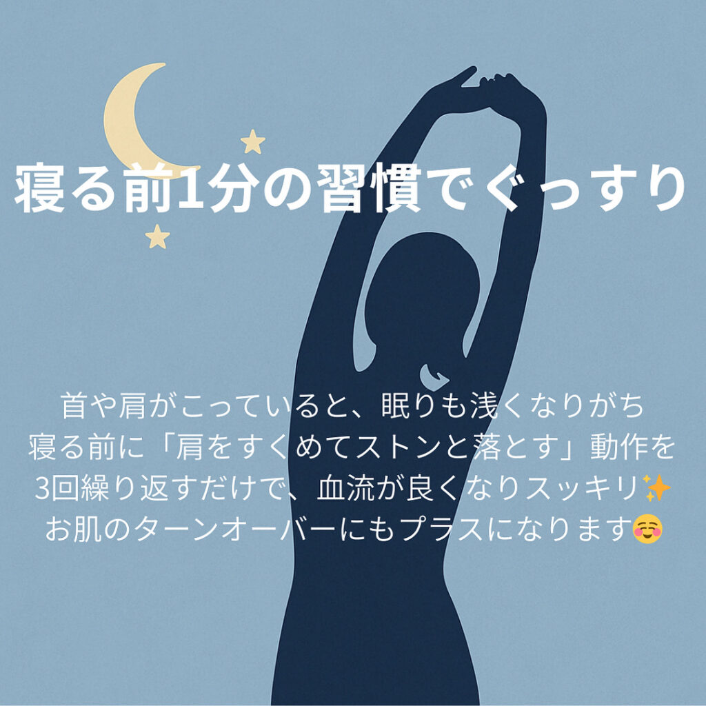 寝る前に「肩をすくめてストンと落とす」動作を3回繰り返すだけで、血流が良くなりスッキリ✨